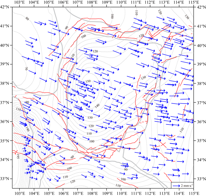 2 研究区概况鄂尔多斯块体及其周缘断陷盆地,地处华北克拉通西部,紧邻青藏高原.块体内部稳定,史上未见MS>6的地震发生,但周缘新构造运动强烈,除西南缘发育强烈挤压兼左旋走滑的弧形断裂束外,块体周缘为一系列运动性质差异明显的断陷盆地(见图 1).位于东缘的山西断陷盆地和西缘的银川断陷盆地具有右旋剪切拉张性质,位于南缘的渭河断陷盆地和北缘的河套断陷盆地则是左旋剪切拉张性质(国家地震局《鄂尔多斯周缘活动断裂系》课题组,1988).上述断陷盆地中曾发生过5次8级以上强震,是中国东部活动强度最高的地震带(李延兴等,2003).