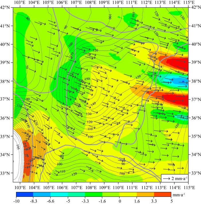 4.2 软流圈物质水平运动的分析模拟结果表明(如图 5所示):在鄂尔多斯地块及周缘底部,整体而言,软流圈物质的水平流速基本一致,流向NWW-SEE向,局部均略有变化.在同一深度,就流向而言,软流圈物质的区域流向为NWW-SEE向,与利用重力位系数反演的大尺度地幔运动(黄建平等,2008)的方向基本一致.其中在鄂尔多斯块体以及北缘和西缘底部,软流圈物质的流向与区域流向基本一致;在西南缘底部,流向略偏转为NW-SE向;在南缘底部,流向则偏转为近EW向;在东缘底部,流向较复杂,南段(临汾盆地)和中段(太原盆地)底部,流向近EW向,而在北段(大同盆地、忻定盆地)底部,流向为NWW-SEE向,呈现出从北段向中段汇流的趋势.就流速而言,软流圈物质的区域水平流速约2 mm·a-1,其中在鄂尔多斯块体北部和北缘底部,流速略大(约2.6 mm·a-1);在块体中部、南部,以及西缘、西南缘和南缘底部,流速则略小(1.3~2 mm·a-1);在东缘底部,流速自南(约2 mm·a-1)向北(约2.6 mm·a-1)略有增大.随着深度增大,软流圈物质的流向保持NWW-SEE向,流速逐渐增大,如在300 km深度,区域流速约21 mm·a-1,局部变化特征不再显著.