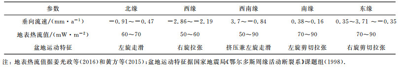 表 2 鄂尔多斯周缘垂向流速、地表热流值、盆地运动特征比较 Table 2 The comparison among the vertical velocity of asthnosphere, surface heat flow values and movement characteristics of fault basins |