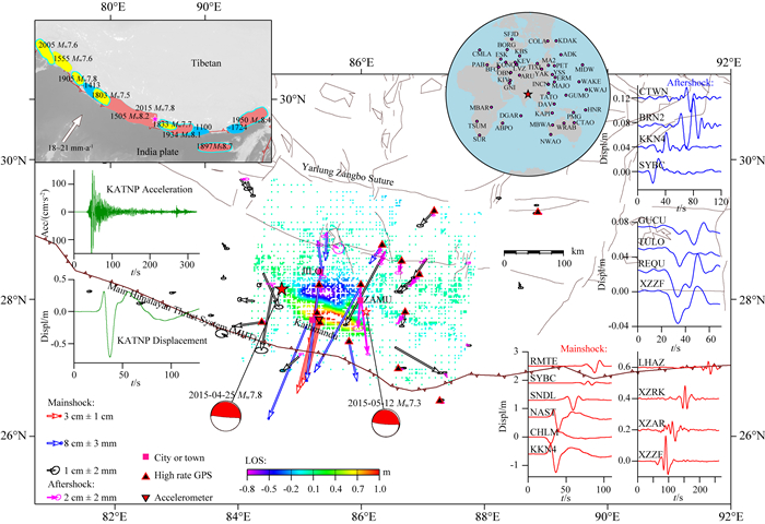 图 1 `尼泊尔地震构造背景及MW7.8主震与MW7.3余震静、动态形变场 红色、蓝色、黑色边框白底箭头为主震GPS水平向同震位移,品红色箭头为MW7.3余震GPS水平向同震位移.彩色点为InSAR重采样LOS形变量(主震4437点/MW7.3余震2405点).红边黑底正三角为高频GPS站点,倒三角形为KATNP加速度记录站点.右侧红、蓝色曲线分别为主震与MW7.3余震滤波后的高频GPS东西向位移时序.左上图为喜马拉雅造山带历史地震分布.左中为加速度计站点KATNP东西向加速度记录及校正后的位移时序.右上为选用的远场地震台站分布. Fig. 1 Tectonic setting of the Gorkha earthquake and surface deformation including permanent offsets and kinematic waves caused by MW7.8 mainshock and MW7.3 aftershock The horizontal displacements of mainshock are depicted using white arrows with red, blue and black frames as well as magenta arrows show the horizontal displacements caused by MW7.3 aftershock. The LOS deformations are annotated by 4437 and 2405 resampled InSAR dots for mainshock and MW7.3 aftershock respectively. The locations of High-rate GPS are highlighted by black triangular with red frame and their east-west filtered deformation waves are plotted on the right side with red and blue curves. The inverted triangular infer the KATNP accelerometer and the left hand is its east-west acceleration recording and adjusted deformation wave both with green curves. The historical earthquakes distribution inserted on the left upper and magenta dots inferring the stations of teleseismic stations used in this paper inserted on the right upper. |