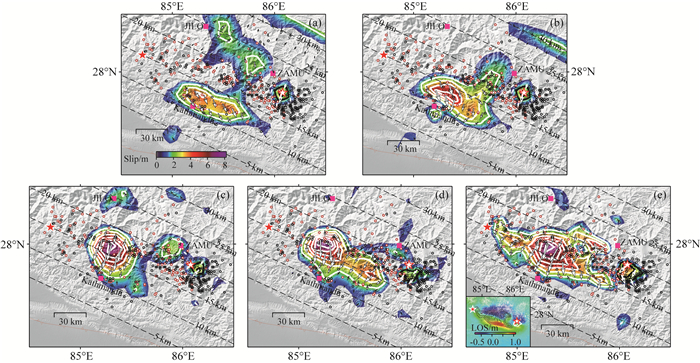 图 2 MW7.8主震与MW7.3余震滑动分布的独立模型 (a)、(b)、(c)、(d)、(e)分别为远震P波、远震P波+近场强震记录(MW7.3余震模型仅由P波反演)、静态GPS、静态+高频GPS及InSAR模型.各子图中红底白边五角星为主震震中,白底红边五角星为MW7.3余震震中;粉色方形为主要城镇加德满都、吉隆及樟木;白色曲线与黑色曲线分别为主震及MW7.3余震的滑动量等值线;白底黑边箭头为主震滑动矢量,黑底白边箭头为MW7.3余震滑动矢量;黑色虚线标明了滑动量所处的深度范围;红色圆圈为主震后MW7.3余震前大于4级的余震,黑色圆圈为MW7.3余震后至2015年12月前大于4级的余震;(e)左下角附图为主震滑动分布(黑色等值线)和MW7.3余震滑动分布(白色等值线)与InSAR形变量分布的比较. Fig. 2 Slip distributions of MW7.8 mainshock and MW7.3 aftershock obtained by the separate inversions (a) Teleseismic P waves; (b) Teleseismic P waves + near-field strong motion (Model of MW7.3 aftershock just inverted by teleseismic P waves); (c) Static GPS; (d) Static GPS+high-rate GPS; (e) InSAR. The red star with white frame and the white star with red frame are the hypocenters of the mainshock and MW7.3 aftershock. Pink rectangles annotate the locations of Kathmandu, JILO and ZAMU cities. White and black contours depict the slip distributions of mainshock and MW7.3 aftershock respectively. The white arrows with black frames and the black arrows with white frames show the slip vectors of mainshock and MW7.3 aftershock respecitvely. Black dashed lines are the depths to the fault. The red circles are the aftershocks greater than M4 before the MW7.3 aftershock and the black circles are the aftershocks greater than M4 after MW7.3 aftershocks and before December 2015. The lower left insert of (e) shows the corresponding locations of slip patterns of mainshock and MW7.3 aftershock depicted with black and white contours and LOS deformation pattern. |