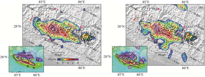 在主震破裂分布方面,远震模型仅笼统勾勒出一个大致轮廓(图 2a),主破裂面深度相对其他模型较浅,滑动量偏小且展示出一定走滑分量;最大滑动位于加德满都以北10 km,中尼边界樟木以西、吉隆以东及30 km以下深度亦出现约为2 m的次级滑动.加入近场的强震记录后,破裂以逆冲为主,分布更为紧凑,滑动峰值区域展布与大地测量模型接近(图 2b);最大滑动量值上升至6 m,吉隆处滑动基本消失.静态GPS模型最大滑动量位置及大小与其他模型具有一致性(图 2c),但分布集中,在走向上展布偏小;最大滑动量位于加德满都以北30 km,樟木以西、吉隆以东也存在2 m的次级滑动.站点数量不变,加入部分站点的高频数据后,GPS模型在走向上限定了主要破裂面范围(图 2d);最大滑动量位置相同,在加德满都东约40 km处出现5 m的次级滑动,吉隆处滑动基本消失.相比较,InSAR模型展现了更多的细节特征(图 2e),显现加德满都西北40 km、北30 km、东50 km处的3个4 m以上的滑动峰值区,以及樟木以西约5 m的滑动,破裂面等值线很好地吻合了LOS形变特征(图 2e插图).最大余震破裂面分布紧凑且特征简单,远震地震波模型显示滑动围绕震中分布,而大地测量模型则表明主要滑动集中在震中南侧.