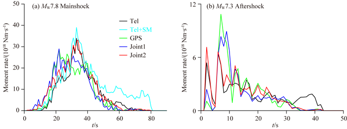 图 4 MW7.8主震、MW7.3余震地震矩释放率函数 (a)主震地震矩释放率函数;(b)最大余震地震矩释放率函数;黑色、青色、绿色、蓝色、红色曲线分别对应于远震P波模型、远震P波+近场强震记录(仅主震模型)、静态+高频GPS模型、近场数据联合模型和全数据联合模型. Fig. 4 Moment rate functions of (a) MW7.8 mainshock and (b) MW7.3 aftershock Teleseismic P waves, teleseismic P waves+near-field strong motion (just mainshock model), static GPS+HRGPS, near-field datasets and all datasets models are corresponding to black, cyan, green, blue and red curves. |