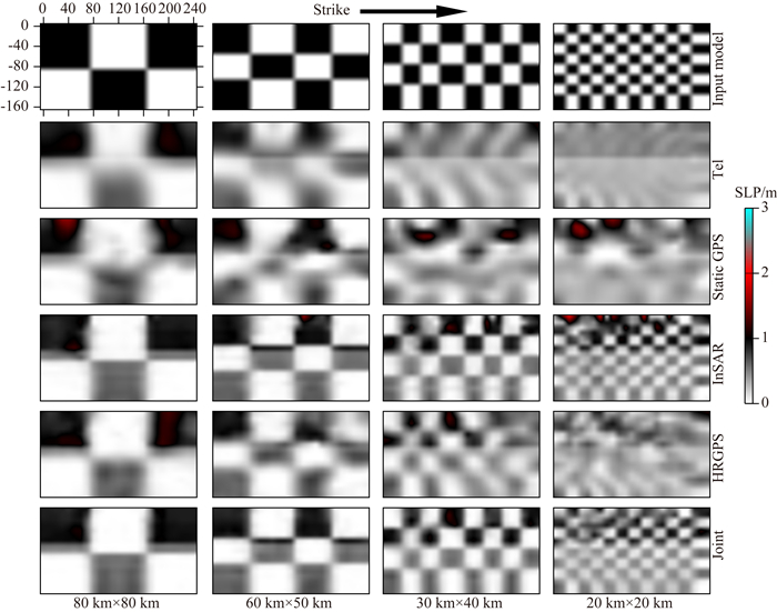 图 5 棋盘检测 由左向右四列依次为破裂面尺寸在80 km×80 km、60 km×50 km、30 km×40 km及20 km×20 km,且正反破裂演速度相同的测试.第一行为设计模型(Input Model),第二至第五行分别为远震P波(Tel)、GPS永久形变(static GPS)、InSAR LOS形变(InSAR)、高频GPS(HRGPS)及联合模型. Fig. 5 Checkerboard tests From left to right, the sizes of slip patches of each column are 80 km×80 km、60 km×50 km、30 km×40 km, 20 km×20 km, respectively. The rupture velocities of simulation and inversion are designed to be the same value in these three tests. The first array are input models, the second line to the last line are the individual inversion of P-waves, static GPS, InSAR and HRGPS and the joint inversion of all data available. |