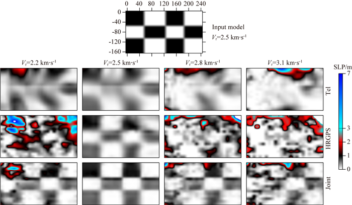 图 6 速度敏感度检测 输入模型滑动尺寸为60 km×50 km,破裂速度为2.5 km·s-1;由左向右四列反演的破裂速度依次固定为2.2 km·s-1、2.5 km·s-1、2.8 km·s-1、3.1 km·s-1,即正反演破裂速度不同的测试.第一行为设计模型(Input Model),第二至第四行分别为远震P波(Tel)、高频GPS(HRGPS,滤去永久形变量后)及联合模型. Fig. 6 Rupture velocity test The size of slip patch of input model is 60 km×50 km, and the rupture velocity of simulation is 2.5 km·s-1. The rupture velocities of inversion are designed to be the different values of 2.2 km·s-1, 2.5 km·s-1, 2.8 km·s-1 and 3.1 km·s-1, from left to right columns, respectively. The first array labeled input models, the second line to the last line are the inversions using teleseismic P waves, HRGPS (without permanent deformation) separately and all data jointly. |