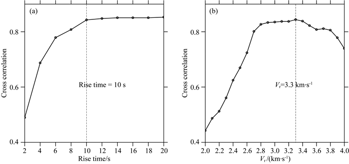4.1 破裂速度与上升时间破裂模型扩展与地震矩释放由破裂速度和子断层上升时间控制,由远震P波和高频GPS约束.本文利用高频GPS观测值与模拟值的平均互相关系数与破裂速度和子断层上升时间的相关曲线来确定主震中两者的最优值(图 7).上升时间10 s为相关曲线拐点,之后趋于稳定说明子断层基本不再释放地震矩,本文选取10 s作为最优值.破裂速度相关曲线在2.8 km·s-1后至3.3 km·s-1间趋于平坦,反演结果具有很好的稳定性,速度大于3.4 km·s-1后,拟合度曲线迅速下降.