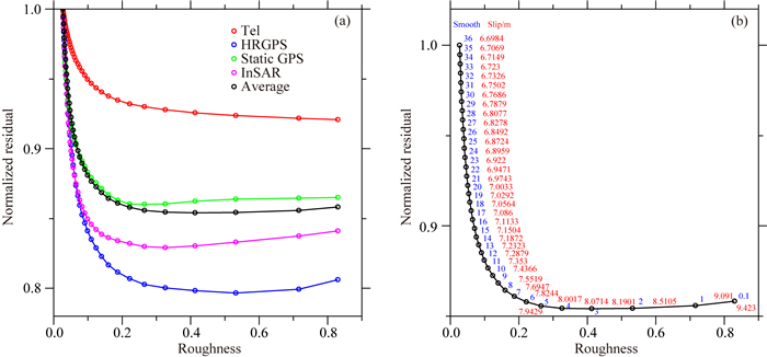 联合反演以均值及采样点数对各类观测数据归一化后进行相对权比的确定,首先确定用于搜索的权比区间,在此区间内选择拟合残差最小的权比值作为最佳相对权比.通过试错,最终选择0.1/1/1/0.8/1/1作为1 Hz GPS、远震P波和5 Hz GPS波形、以及强震记录、GPS和InSAR位移反演的权比,相对而言1 Hz采样GPS数据被降权,其余资料基本按其名义精度处理.确定平滑因子时,将权值较大的4类数据拟合残差加权平方和与粗糙度的折衷曲线拐点作为平滑因子最佳值固定.
