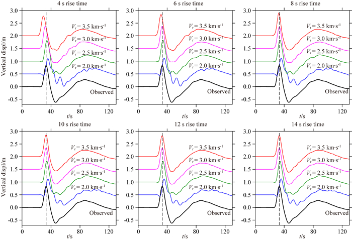 图 S1 不同子断层上升时间和破裂速度在KKN4垂直向的模拟值与观测值的比较 Fig. S1 Synthetic vertical displacements featured with different rupture velocities and rise times at station KKN4 from the 24 scenario models compared to the observed data (black trace) |