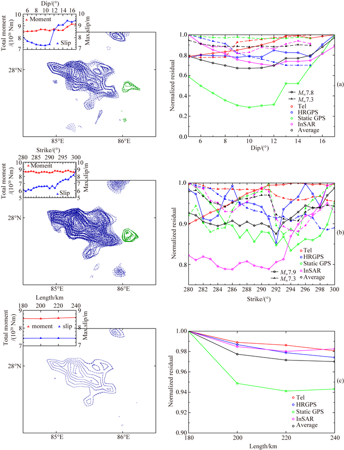 图 S2 倾角(a)、走向(b)及长度(c)的格网搜索结果 左列图为不同参数值的主震滑动等值线(蓝色)与MW7.3余震滑动等值线图(绿色),分布具有较高的重叠性;左上附图为不同参数值的主震总地震矩(蓝色)与最大滑动量(红色),离散度不大.右列图为不同参数值的参数曲线(实线圆圈为主震模型,虚线三角为MW7.3余震模型,远震P波、高频GPS、静态GPS、InSAR残差曲线分别对应于红色、蓝色、绿色、品红色,平均残差为黑色). Fig. S2 Grid search for dip, strike and length (a), (b) and (c) corresponding to the results of slip contours and normalized residuals versus the different value of dip, strike and length (just for mainshock) for each dataset, respectively. The left pictures show the slip distributions of mainshock and the MW7.3 aftershock profiled by blue and green contours respectively. The contours show good coincidence. The higher left inserts of left pictures present little scattered total moment (blue) and max slip (red) of mainshock versus the different value of parameters. The right pictures show the normalized residuals of different datasets versus the different values of parameters. Teleseismic P, High rate GPS, static GPS, InSAR and average value corresponding to the red, blue, green, magenta and black color, as well as the solid line with open circle and the dashed line with open triangle represent the mainshock and the MW7.3 aftershock, respectively. |