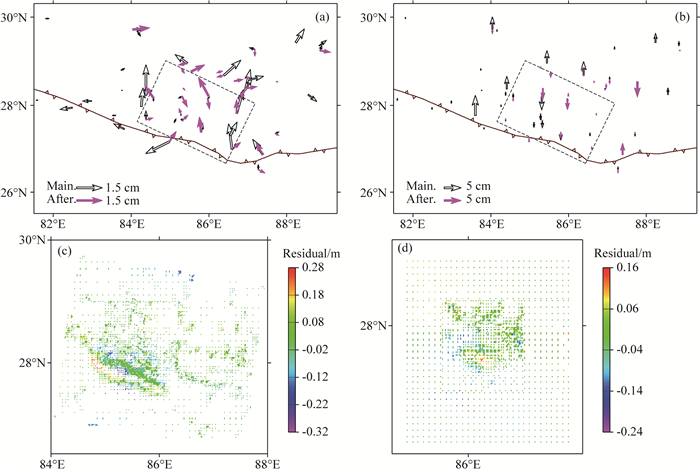 图 S3 同震永久形变的模拟值与观测值的拟合残差 (a), (b)分别为水平向和垂直向的GPS同震永久位移拟合残差,白底黑边箭头代表主震残差,品红色箭头代表MW7.3余震残差;(c), (d)分别为主震与MW7.3余震LOS形变量的拟合残差. Fig. S3 Residuals between observed and synthetic coseismic permanent displacements (a) and (b) are horizontal and vertical residuals of GPS permanent displacements, and the white arrows with black frames correspond to the mainshock as well as the magenta arrows correspond to MW7.3 aftershock. (c) and (d) show the residuals of LOS displacements of mainshock and MW7.3 aftershock respectively. |