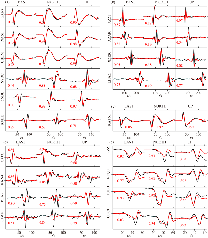 图 S4 强地面运动的模拟值与观测值的比较 (a), (b)和(c)分别为主震5 Hz GPS、1 Hz GPS和加速度积分至位移的三分量的模拟值(红色)与观测值(黑色)比较;(d), (e)分别为最大余震5 Hz和1 Hz GPS三分量的模拟值(红色)与观测值(黑色)比较;图中的红色数字为模拟值与观测值的互相关系数. Fig. S4 Comparison of observed and synthetic strong motions (a), (b) and (c) are the comparisons between displacement waveforms derived from 5 Hz GPS, 1 Hz GPS, accelerometer observed data (black) and the model predictions (red) of mainshock. (d), (e) are the comparisons of 5 Hz, 1 Hz GPS observed data (black) and the synthetic data (red) of MW7.3 aftershock. All the red numbers annotate the cross correlation coefficients between observed and synthetic data. |