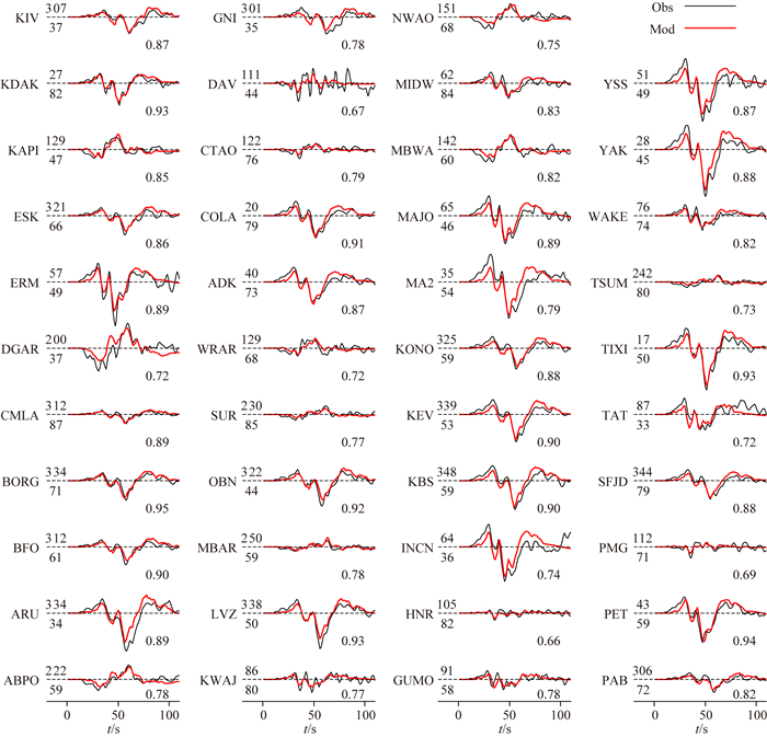 图 S5 远震P波的模拟值与观测值的比较 红色曲线为模拟值,黑色曲线为观测值;曲线左方为站名,左上方数值为方位角,左下方数字为震中距,右下方数字为模拟值与观测值的互相关系数. Fig. S5 Comparison of observed and synthetic waves of teleseismic P wave Red lines are the observed waves and black lines are the synthetic waves. In each sub-graph, the station name is on the left of curves along with the azimuth (upper) and epicenter distance (lower) in degree. The cross correlation coefficient is on the right bottom of each waveform. |