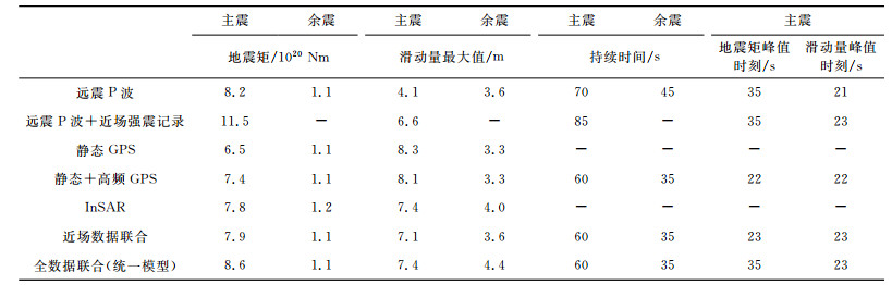 3 结果与检验 3.1 独立模型与联合模型为了解分析GPS观测对统一建模的作用,本文既单独反演远震P波、远震P波+近场强震、静态GPS、静态+高频GPS、InSAR数据,也联合反演不同数据组合,获得一系列独立和联合模型(包括统一模型).各模型的特征见列表 1和图 2, 3.