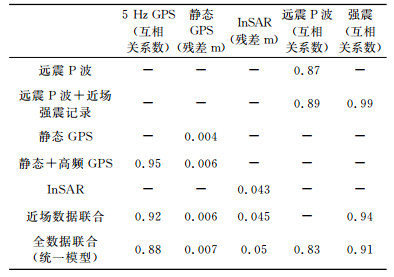 表 2 主震各种模型的模拟值与观测值拟合平均残差与互相关系数 Table 2 Mean residuals and cross correlation coefficients of separate and joint inversions of mainshock |