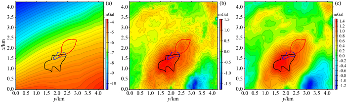 图 16 递减半径非线性迭代法重力异常分离 (a)区域异常; (b)局部异常; (c)去浅层后的局部异常. Fig. 16 Gravity anomalies separated by the decreasing radius nonlinear iterative method (a) R(x, y, r30); (b) L(x, y, r30); (c) L(x, y, r30)-L(x, y, r2). |