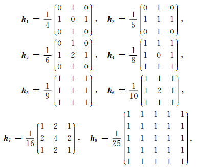 顺便指出:若式(1) 中取b1=1/4,b2=0,则式(1) 为简单的四点圆周平均公式;取b1=b2=1/9,在式(1) 右边加一项b1u(x, y),则式(1) 便成为9点滑动平均(moving average)公式,它们分别属于如下一组滤波器(Gonzalez and Woods, 2008;王一丁等. 2015) 中的h 1和h 5.
