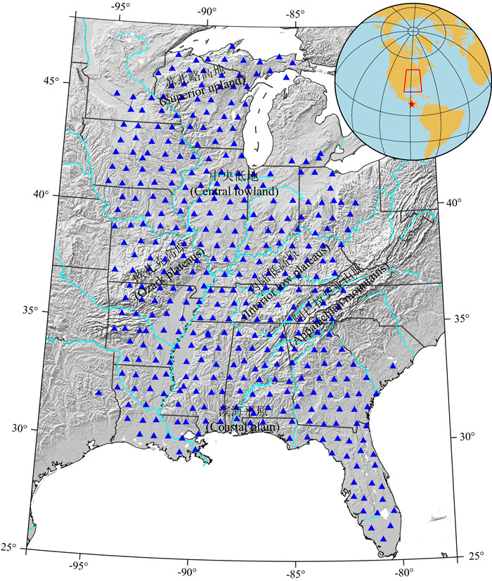 近年来不同尺度(全球的,区域的,局部的)的地震台阵迅速发展.最典型的例子就是美国的USArray计划.USArray是EarthScope计划的组成部分.由400个宽频带地震台组成的间距约70 km的滚动台阵由西向东布设.目的是查明美国境内的大陆结构以及演化(李秋生等,2010).通过分析USArray的数据发现,在美国西部和中部地区由于历史上的板块俯冲使上地幔的结构非常复杂(Brudzinski and Allen, 2007; Yang and Ritzwoller, 2008; West et al., 2009; Liang and Langston, 2009; Schmandt and Humphreys, 2010; Levander et al., 2011; Obrebski et al., 2011; Schmandt and Humphreys, 2011; Shen et al., 2013a, 2013b; Evanzia et al., 2014; Langston and Horton, 2014; Porritt et al., 2014),并表现出显著的横向不均匀性.同时,USArray也为各种新方法的提出和发展提供了必不可少的测试数据(Liang and Langston, 2009; Lin and Ritzwoller, 2011; Pavlis et.al, 2012).然而通过USArray数据对美国东部区域的研究才刚刚开始(Burdick et al., 2014; Schmandt and Lin, 2014; Jin and Gaherty, 2015; Liu and Holt, 2015).