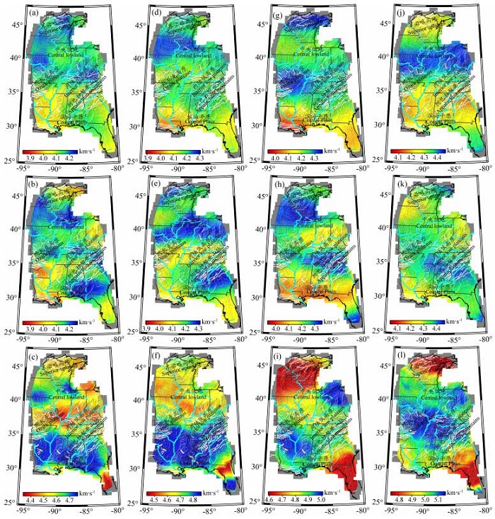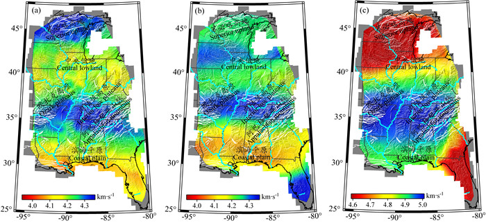频带在60~80 s的面波受到上地幔顶部速度结构的影响较大.在这个频带垂向分量和径向分量的相速度在北部地区以及南边的阿巴拉契亚山脉以南的地区呈现为高速特征,而在西南边和佛罗里达半岛呈现为低速异常(图 10a和10b).其结果与面波成像的相速度结果相似(Pollitz and Mooney, 2016).对于切向分量,在滨海平原,阿巴拉契亚山脉南段呈现出高速特征,在欧扎克高原及其北边区域,阿巴拉契亚山脉以北显示为低速特征(图 10c).切向分量的相速度在欧扎克高原及其南边区域与西南地区的差异较大.由于同一周期瑞雷波与勒夫波采样深度不一样,这可能是相速度差异的原因之一,也有可能体现了介质径向各向异性.