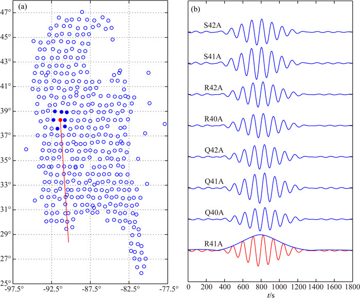 图 2 子台阵分布及其波形 (a)圆圈表示记录中美洲西海岸地震事件的台站,带颜色的圆圈表示子台阵的台站,其中红色实心圆圈表示主台站,而蓝色实心圆圈表示为辅助台站,红色直线表示地震波传播的射线方向;(b) 图 2a中子台阵垂向分量的地震波形.最底部的红色波形为图 2a中红色实心圆圈表示的主台站R41A地震记录,其他为辅助台站的波形,台站名标注在波形旁边. Fig. 2 Geometry of a subarray with waveforms (a) Circles represent stations that recorded the event from the Coast of Central America, circles with colors are stations of subarray, which circle with red is master station and circles with blue are support stations, the straight line shows the ray direction; (b) Waveforms of subarray shown in (a).The bottom trace is the waveform of the master station R41A, and other traces are waveforms of supporting stations, station names are annotated. |