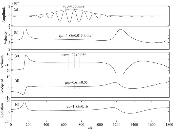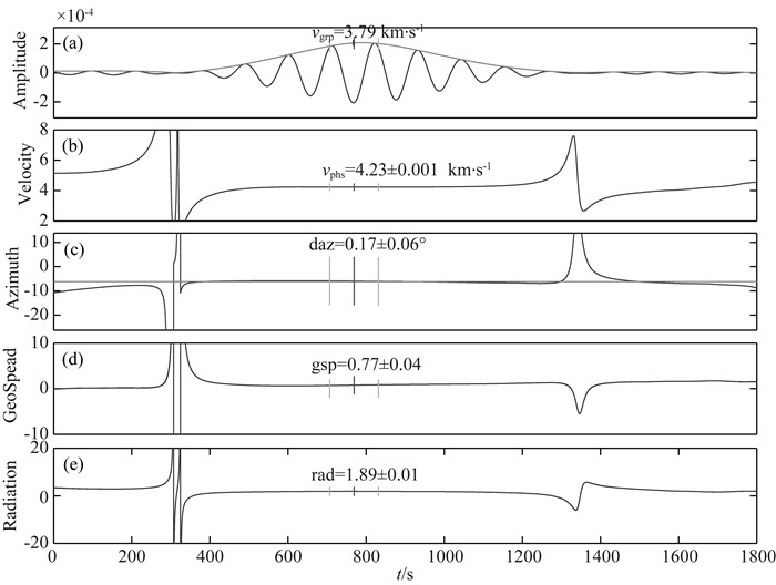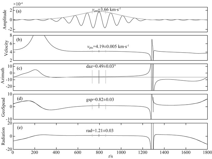 图 3 R41A台垂向波形梯度结果 (a) R41A台站记录的滤波之后的波形,中间的短竖线表示波形峰值的时间点,在其旁边的数值为群速度,而两侧颜色较浅的竖线之间的距离为一个波长的宽度;(b)相速度;(c)传播方向,水平直线表示事件与台站之间大圆路径的方位角;(d)几何扩散;(e)辐射花样.在图(b,c,d,e)中,两个数值分别表示为相应参数值以及对应的测量误差. Fig. 3 Wave gradiometry results for vertical component of R41A (a) Filtered waveform of the master station (R41A), the vertical bar in the middle marks the timing of the waveform peak, the group velocity values at this time are shown beside the bar, range of the another bar shows the width of a wavelength; (b) Phase velocity; (c) Wave directionality, the horizontal line is the great circle azimuth; (d) Geometrical spreading; (e) Radiation pattern. On Figures 4b, 4c, 4d, and 4e, the two numbers are the corresponding parameter values and errors, respectively. |