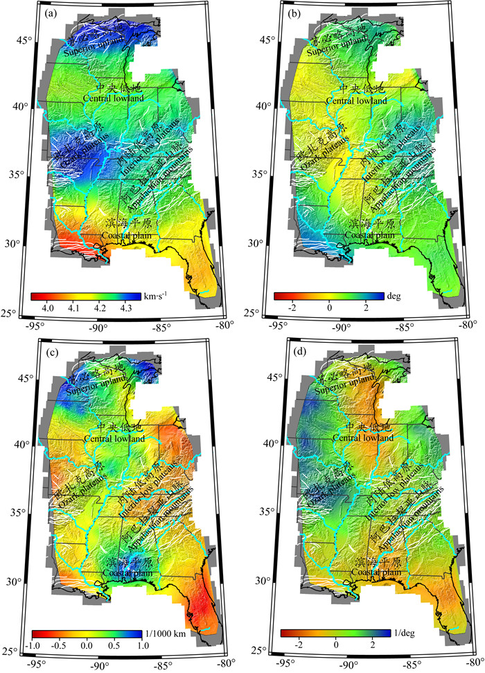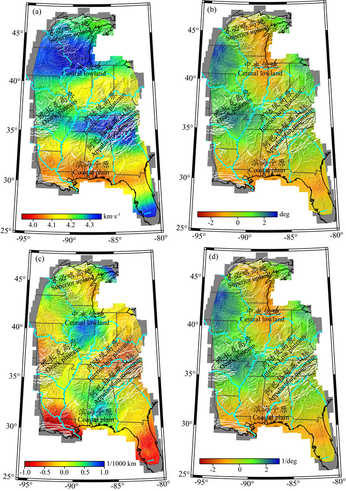 图 9为切向分量的波形梯度结果,即勒夫波的波形梯度结果.对于勒夫波而言,由于其相速度大于瑞雷波的相速度,图 9a中的平均相速度在4.8 km·s-1,远大于垂直分量和切向分量的平均相速度(4.15 km·s-1).图 9a中明显的特征是佛罗里达半岛以及北边区域速度较之其他区域偏低,研究区域的中部整体相速度较高.和垂向分量的结果图 7a相比,主要差异在于北部区域.在图 7a中,北部区域的相速度相比其他区域较高,而在图 9a中刚好相反.说明可能地下结构存在明显的径向各向异性.图 9b为传播方向变化.图 9c的几何扩散结果,和垂向分量和径向分量的传播方向变化相比有较强的一致性.在阿巴拉契亚山脉以南佛罗里达半岛以北的区域传播方向变化略大.说明了几何扩散与地震波传播方向的关系很小.图 9d表示辐射花样,总体表现为西正东负,与传播方向的相关性不明显.