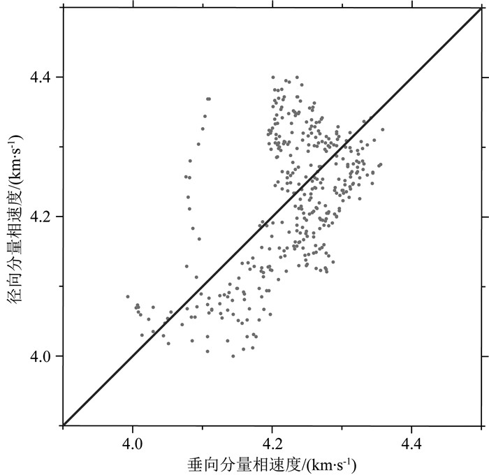 图 8 垂直分量相速度(横轴)与径向分量相速度(纵轴)交会图 Fig. 8 Scatterplots of phase velocity obtained from vertical (Horizontal) and radial (Vertical) component, respectively. |