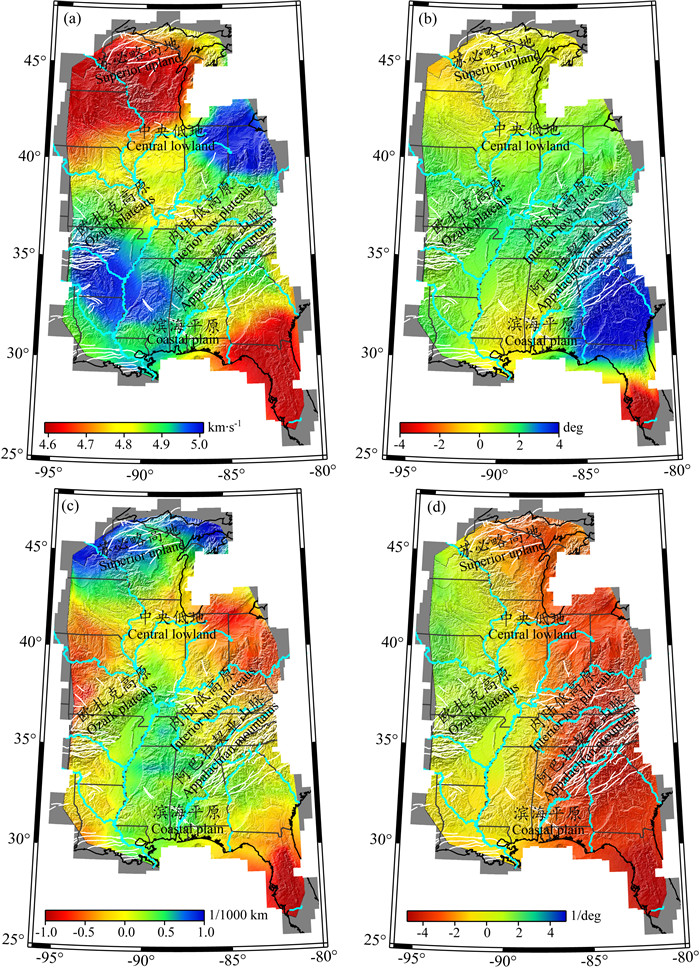 通过式(22) 可以看出几何扩散体现射线方向上的振幅变化.如图 6c,几何扩散高的地方表示为振幅放大,几何扩散低的地方表示为振幅衰减.在伊利诺伊盆地以及墨西哥湾沿海平原表现为几何扩散高的特征,这两个区域都有较厚的沉积层,伊利诺伊盆地的北边沉积层最厚的地方厚度达到约6 km(Buschbach and Kolata, 1991),有利于波形的放大作用.几何扩散与传播路径的关系很小.