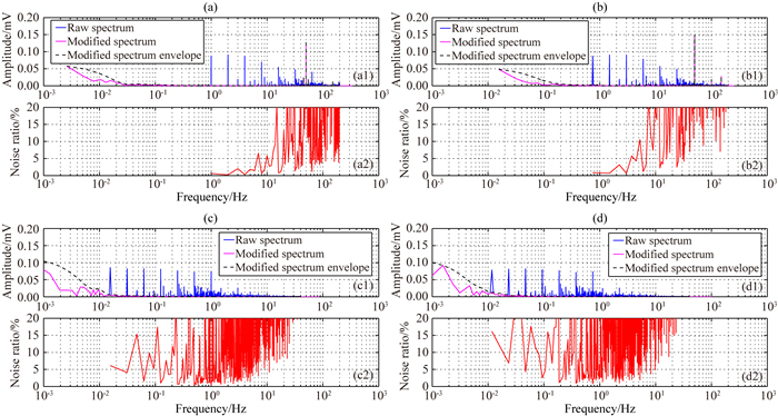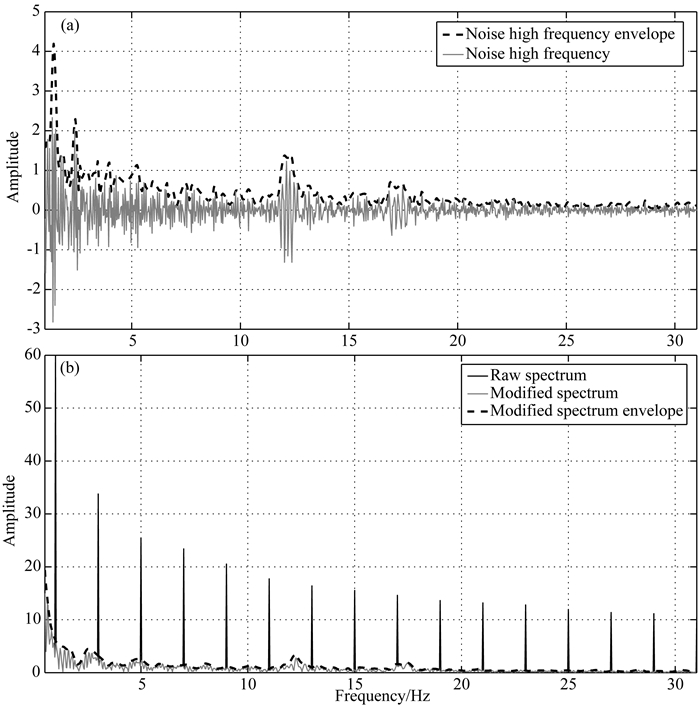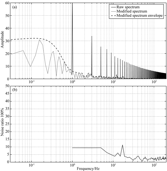 以对数坐标绘制完整的频谱曲线,见图 11a(即对图 10b对数坐标显示),主频及谐波成分共100个频率(主频为1 Hz,谐波为3~199 Hz),图中包括原始数据的频谱曲线,噪声预处理频谱曲线,以及噪声频谱上包络线.