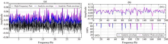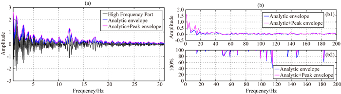 图 12a为对高频部分进行包络算法后的包络线特征,其中蓝色线为解析包络结果,而红色线为联合解析包络和极值包络的结果,其中极值包络是针对解析包络线进行的,目的是获得更大包络比例.