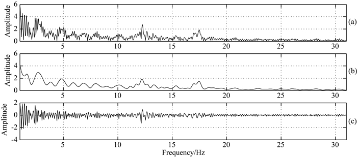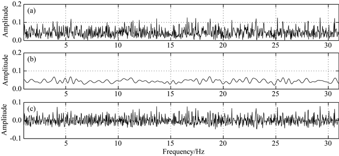 图 13 对高斯噪声频谱进行三级小波分解 (a)噪声预处理频谱曲线; (b)低频部分(A3); (c)高频部分(D1+D2+D3). Fig. 13 Wavelet decomposition on Gaussian noise spectrum (a) Modified spectrum (S); (b) Low frequency part (A3); (c) High frequency part (D1+D2+D3). |