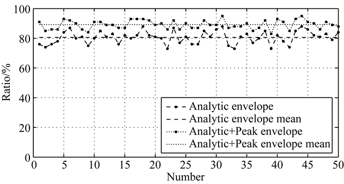 图 15 针对50组高斯噪声频谱曲线应用基于解析包络和极值包络后包络比例变化曲线 Fig. 15 Envelope ratio test based on 50 sets of Gaussian noise |
