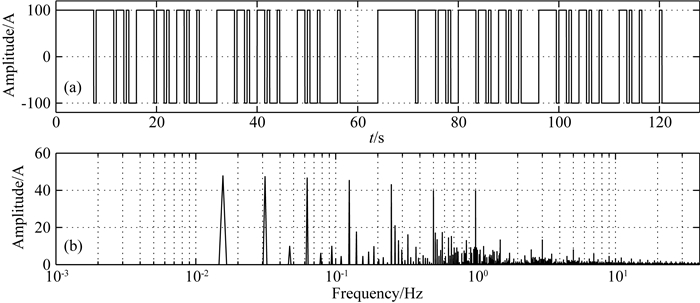CSEM信号几乎都是基于伪随机编码(Pseudo Random Binary Signal)发送的,周期方波信号是伪随机信号的最简单形式,众多商用频率域电磁仪采用方波信号,一般采用扫频方式进行勘探,即通过不断改变主频,获得不同频率的电磁响应,野外施工效率并不高(汤井田,2005).为了提高勘探效率和信号抗干扰能力,伪随机信号被引入电磁勘探领域,其中具有代表性的2n序列伪随机信号(何继善, 2010a, 2010b)能够同时采集多个频率信息,而且对数坐标下其频率域能量分布均匀,更符合勘探需要.伪随机信号电法的核心是发送机将不同频率的电流波形合成为伪随机电流后向地下供电,接收机同时接收这些频率经大地后的响应并将其分离,因此,一次供电,便可完成多频率的测量,具有快速、高效、电源利用率高等优点.