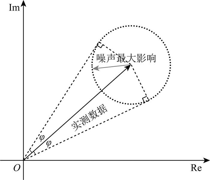 图 2 在CSEM频率噪声对频率域系数的影响示意图(对幅度和相位的影响) Fig. 2 The possible biggest influence of noise with certain amplitude on CSEM frequency coefficient (influence on amplitude and phase) |