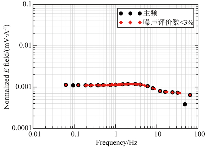 汇总4个频组中噪声评价数据,并分别以3%误差和5%误差为阈值进行了有效频率提取,图 19中蓝色点为噪声评价数小于5%的频率归一化电场信号,黑色点为主频,48 Hz明显受到工频干扰,通过本文方法的筛选,受到工频干扰严重的48 Hz信号被剔除,且在32 Hz与64 Hz之间,提取了部分可用谐波成分,提高了该频率段的频率密度;图 20中红色点为3%误差阈值的提取结果后对其归一化结果,黑色点为主频.