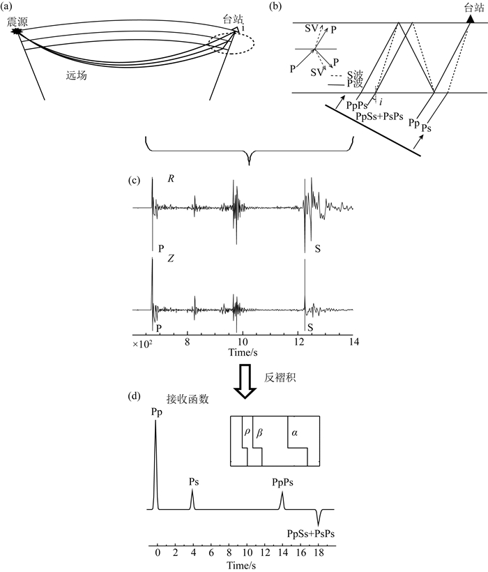 1 方法由于远震事件到台站的距离足够远,地震波传播到台站下方时,以很陡的角度入射到台站(图 1a),可近似为平面波(图 1b).地震波到达接收台站会形成直达P波(Pp),也会在界面转换成S波(Ps),还会在地表反射遇到下方的间断面后再次反射到达地表就会形成多次波,在多次反射中也会产生P波和S波之间的转换以及PpPs和PpSs+ PsPs震相.图 1c为以爆炸源为震源的理论地震图,通过水平和垂直分量的反褶积可得到反映接收台站下方速度结构的接收函数时间序列(图 1d).下面结合接收函数计算过程,对震相幅度进行深入分析.