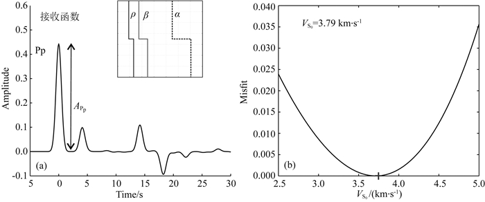 其中Aobs为Pp幅度的观测值,Asyn为Pp幅度理论值,Σ表示对不同射线参数的网格扫描叠加.根据公式(10)计算misfit(VS0),其最小值所对应横坐标为VS0的最优值(图 2b).如图 2a所示单个震中距的R向接收函数(RRF)测量其Pp波幅度,从而得到VS0.
