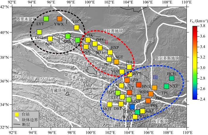 图 5 台站分布和近地表S波速度 Ⅰ区域为99°E以西的塔里木盆地和祁连地块的交汇区域,Ⅱ区域为99°E—103°E的祁连—河西走廊区域,Ⅲ区域为103°E以东的甘东南区域. Fig. 5 The distribution of stations and the sub-surface S-wave velocity in the region The area Ⅰ is intersection of the Tarim Basin and the Qilian block west of 99°E; The Ⅱ area is the Qilian-Hexi corridor region of 99°E—103°E, and the Ⅲ area is the southeastern Gansu region of terrain gradient zone east of 103°E. |