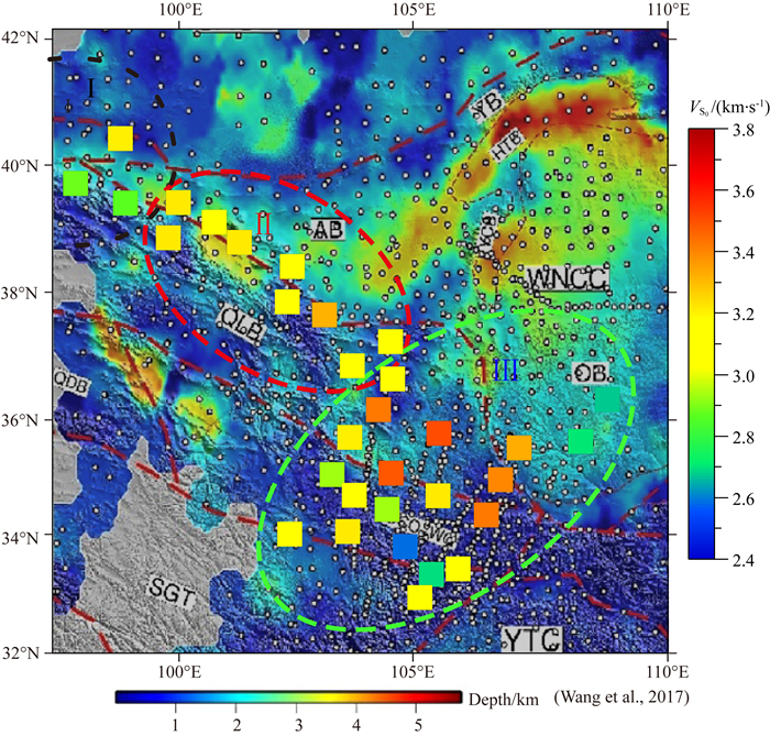 (3) 与祁连—河西走廊区域相比,在103°E以东的甘东南区域的VS0较为复杂(图 5中Ⅲ区域),最小为2.68 km·s-1,最大达到3.51 km·s-1,差异十分明显.导致VS0变化较大的可能原因在于该区域构造活动特殊,处于青藏块体、鄂尔多斯块体和扬子块体这3个块体碰撞作用的交接区域,成为青藏高原东部边缘最大的地形梯度带(Pan and Niu, 2011;沈旭章等,2013;Shen et al., 2017),因而相关的介质结构稳定性差,会在局部区域出现S波速度变化较大的结果(Ⅲ区域).