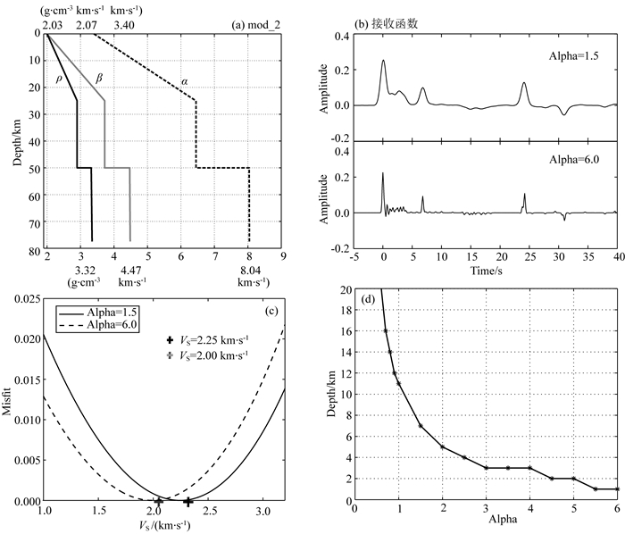 图 7 数值模型1的接收函数及alpha和反映深度的关系 (a)地表 0~35 km梯度变化的速度模型;(b) alpha为1.5和6.0的接收函数;(c) alpha为1.5和6.0时对应的S波速度;(d) alpha和反映深度的关系. Fig. 7 Relationship between the Gaussian filter with half-width (alpha) of calculate receiver function and the S-wave velocity corresponding depth for velocity model_1 (a) The velocity model of 0~35 km gradient change on the surface; (b) The receiver function of alpha is 1.5 and 6.0, and the S-wave velocity (c); (d) The relation between the alpha and the depth corresponding to the S-velocity structure. |