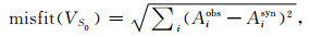 对于每一步搜索过程中的VS0都可算出不同震中距Pp幅度的理论值,其观测值和理论值之间的差值用适配函数misfit(VS0)表示,可作为衡量VS0是否接近实际值的标准.misfit(VS0)定义为