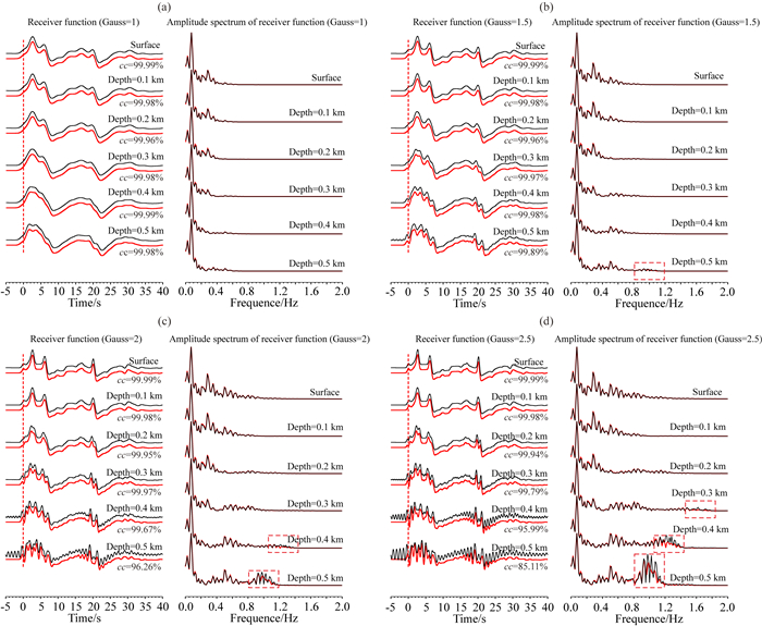图 8 高斯因子及接收点深度对接收函数及振幅谱影响图 黑色表示频率域水准量反卷积方法结果,红色表示时间域迭代反卷积方法结果. (a)高斯因子为1时,接收函数(左)及其振幅谱(右); (b)高斯因子为1.5时,接收函数(左)及其振幅谱(右); (c)高斯因子为2时,接收函数(左)及其振幅谱(右); (d)高斯因子为2.5时,接收函数(左)及其振幅谱(右). Fig. 8 The influence of Gaussian factor and receiver depth on receiver function and amplitude spectrum Black lines indicate the result of the frequency domain water-level deconvolution method and red lines indicateresult of the time domain iterative deconvolution method. (a) When the Gaussian factor is 1, the receiver function(left) and its amplitude spectrum(right); (b) When the Gaussian factor is 1.5, the receiver function(left) and its amplitude spectrum(right); (c) When the Gaussian factor is 2, the receiver function(left) and its amplitude spectrum(right); (d) When the Gaussian factor is 2.5, the receiver function(left) and its amplitude spectrum (right). |