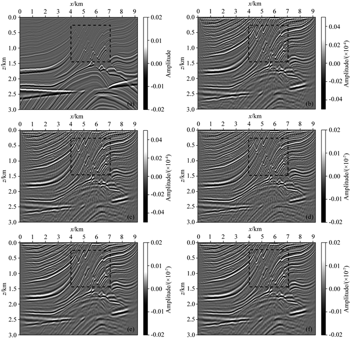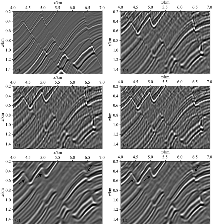 为了更好地观察各类方法的成像效果,我们将图 9中的虚线黑框部分放大(图 10).从图中可以更清楚地看到,SE-LSRTM对于成像中的陡倾角不连续结构过度平滑造成了结构细节的丢失,这还是在我们选择了一个非常小的平滑半径5的情况下.图 10f中WSE-LSRTM方法得到的局部放大成像剖面中串扰噪声也得到了较好的压制,虽然相比于SE-LSRTM仍然有些许的串扰噪声包含在内,但其对于成像中的陡倾角结构(图中黑色箭头标注部分)有着很好的保护,陡倾角结构成像更为清晰.