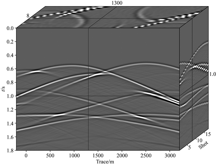 表示将每隔16个炮的两个常规单源炮混合为一个同时震源炮记录.16个同时震源混合炮集如图 2所示,其中直达波已被切除.正演中选用了主频为20 Hz的Ricker子波作为震源,时间采样间隔为1 ms,记录长度为1.8 s.