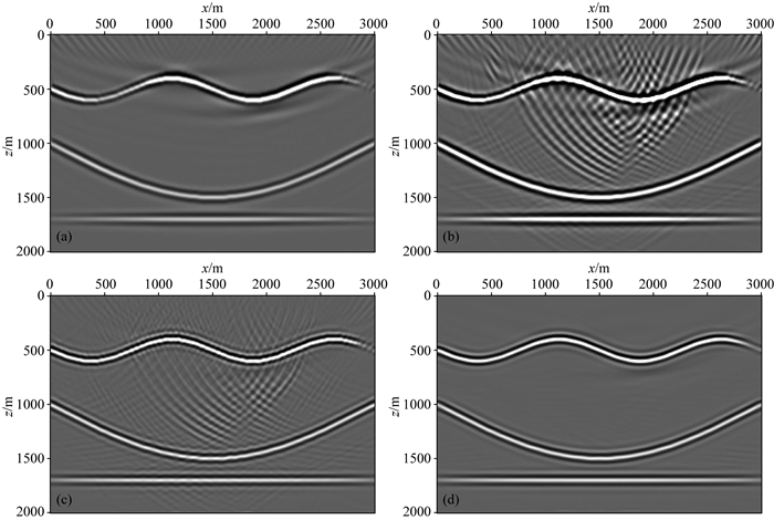 接下来,分别利用RTM,LSRTM以及本文的WSE-LSRTM方法对SS数据进行偏移成像,迭代次数均为10次,偏移速度模型为对原速度模型做平滑后得到的光滑速度模型.图 3a为SS数据直接RTM成像剖面,成像中包含有明显的偏移脚印带来的假象和很强的串扰噪声,特别是在浅部.图 3b为LSRTM得到的成像剖面,与RTM结果相比,LSRTM能够减弱一部分串扰噪声,但效果有限,剖面中仍残存有较强的噪声.图 3c和图 3d均为WSE-LSRTM方法得到的反演成像结果,不同之处在于,图 3c使用的结构信息直接从RTM成像剖面中提取,在整个迭代过程中保持不变,而图 3d中每次迭代使用的结构信息从前一次迭代结果中提取.从结果对比中可以看出,本文WSE-LSRTM方法采用的提取结构信息的策略更为可靠.与LSRTM成像相比,WSE-LSRTM方法能够有效地去除串扰噪声,界面刻画锐利,不仅偏移脚印消失了,串扰噪声也得到了很好的压制,得到的成像结果平滑连续,能量也很好的集中于界面上,且深部照明也得到了一定的补偿.从该简单模型测试中可以看出,WSE-LSRTM方法在对简单模型的SS直接成像中能取得很好的效果,验证了该方法的有效性.