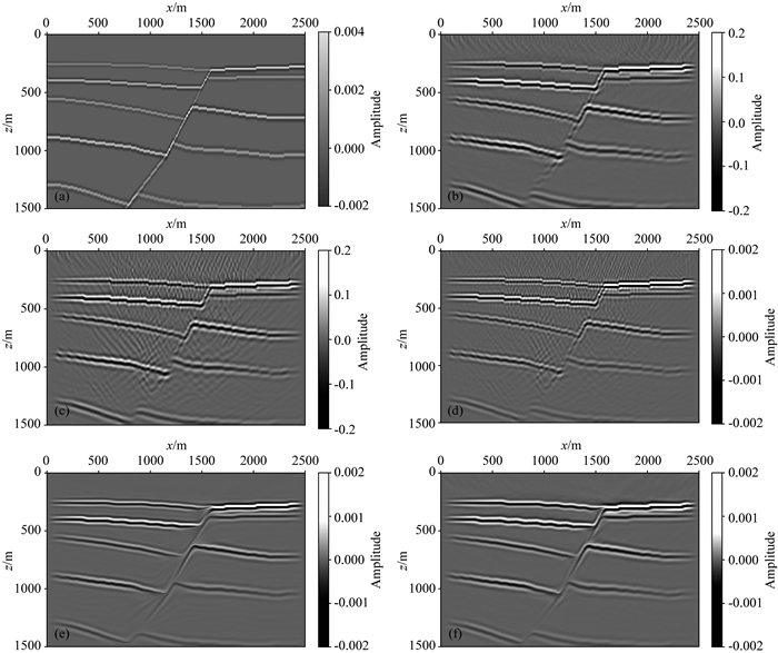 图 6 简单断层模型偏移结果比较 (a)反射率模型;(b)常规单源数据RTM结果;SS数据(c)直接RTM结果;(d) LSRTM迭代5次结果;(e) SE-LSRTM迭代5次结果;(f) WSE-LSRTM迭代5次结果. Fig. 6 Migration results of simple model with fault (a) Reflectivity; (b) RTM result of conventional acquisition; (c) RTM result of SS data; (d) LSRTM result of SS data after 5 iterations; (e) SE-LSRTM result of SS data after 5 iterations; (f) WSE-LSRTM result of SS data after 5 iterations. |