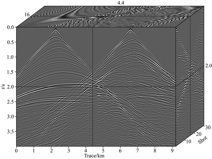 在常规单炮地震数据采集中,需设置较大的放炮间隔来避免炮与炮之间在时间上产生混叠,这会带来采集工时长以及炮点采样稀疏等问题,从而导致获得的原始数据品质较低.而同时震源采集(Simultaneous-source acquisition)技术(Aaron et al., 2009; Abma et al., 2012; Beasley, 2008; Berkhout et al., 2008; Berkhout, 2008; Hampson et al., 2008)不受放炮间隔时间的限制,允许炮记录存在重叠,可以同时或短时内激发多个震源,在提高采集效率的同时,可以获得密集采样,宽方位覆盖的高质量数据,不仅如此,由于其允许混叠的特性,数据体积也被大大地减小.SS技术在工业上有着广泛的应用前景,国外各大石油公司已经投入了实际生产中,如何对SS数据进行偏移成像成为了国内外学者和研究人员的研究热点.
