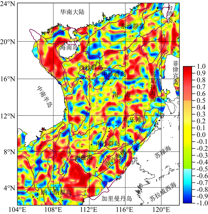 图 3 南海及邻区化极磁力异常图 Fig. 3 Reduction to the pole magnetic anomalies in the South China Sea and adjacent areas |