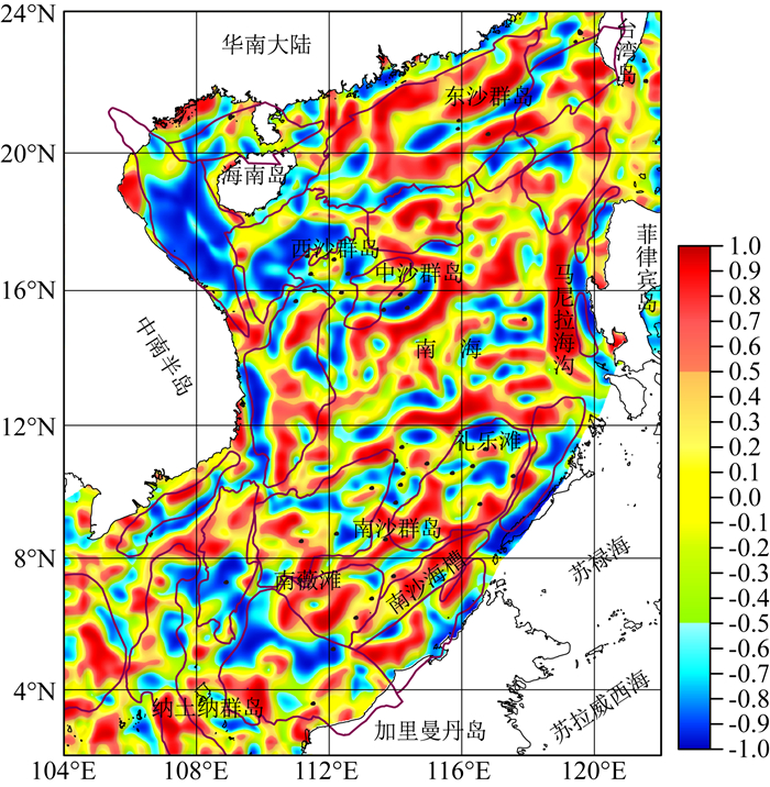 图 5 南海及邻区居里面引起的化极磁异常s Fig. 5 RTP of magnetic anomalies caused by Curie surface in the South China Sea and adjacent areas |