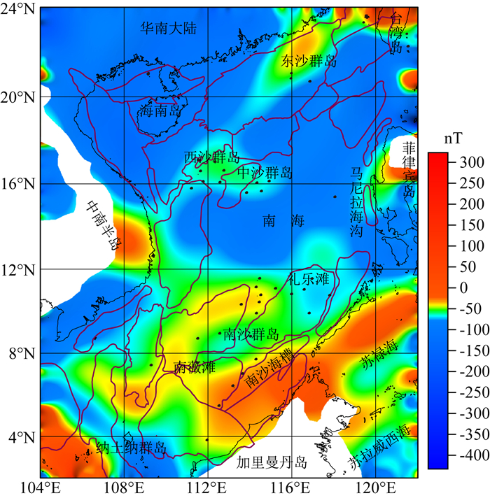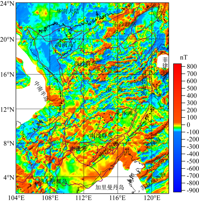 图 2 南海及邻区磁力ΔT异常图 Fig. 2 Magnetic anomalies in the South China Sea and adjacent areas |