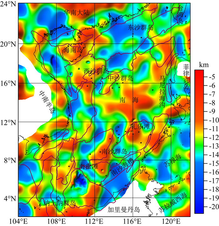 南海及其邻区磁性基底以NW、NE和NEE走向为主,深度5~20 km(图 6).南海洋盆北侧以NEE向为主,南侧以NE向为主,体现了北部被动拉张和南部陆块间碰撞的不同构造活动.中南半岛周缘的磁性基底呈NW、NNW走向,洋壳扩张过程中的印支板块向东滑移、红河断裂不同方向的走滑,为该处磁性基底走向形成的重要因素.磁性基底深度在16 km以上区域有:南海洋盆北侧靠近洋壳区的珠江口盆地—双峰盆地—尖峰盆地、中南半岛附近的北部湾盆地北部—莺歌海盆地—中建南盆地、南沙群岛附近的南薇盆地西部—北康盆地西部、纳土纳群岛附近的马来盆地—纳土纳盆地;磁性基底深度在6~15 km主要分布在北部湾盆地东部—琼东南盆地—洋壳区、礼乐盆地北部—巴拉望盆地、莺歌海盆地南部—中建南盆地西部—湄公盆地—万安盆地、南薇东盆地—曾母盆地东部.